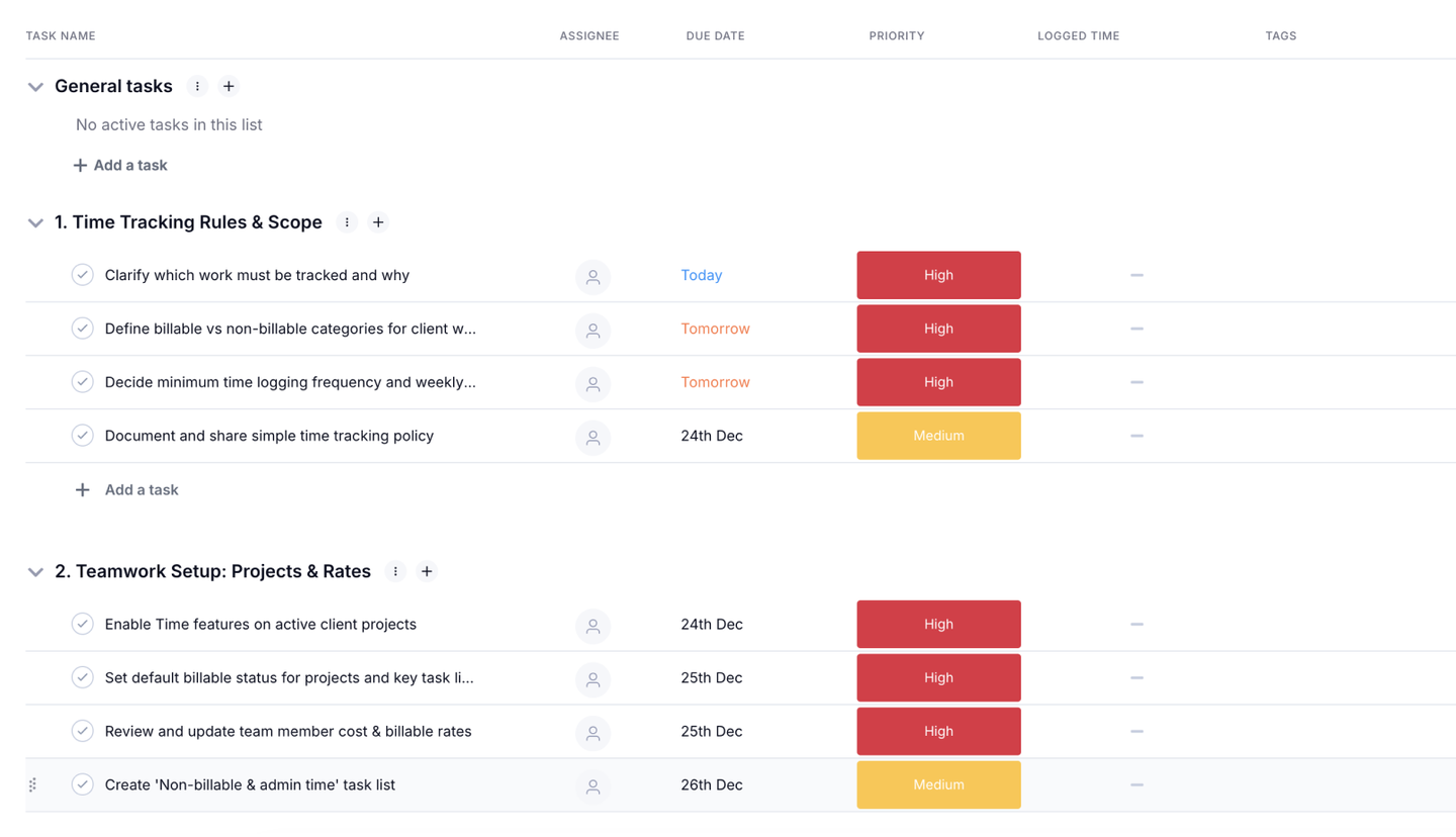 Your team then logs time directly in Teamwork, choosing the right project, task, and category. The template gives you a clear structure that keeps entries consistent, whether someone is tracking consulting time, creative work, or internal effort that supports client projects.